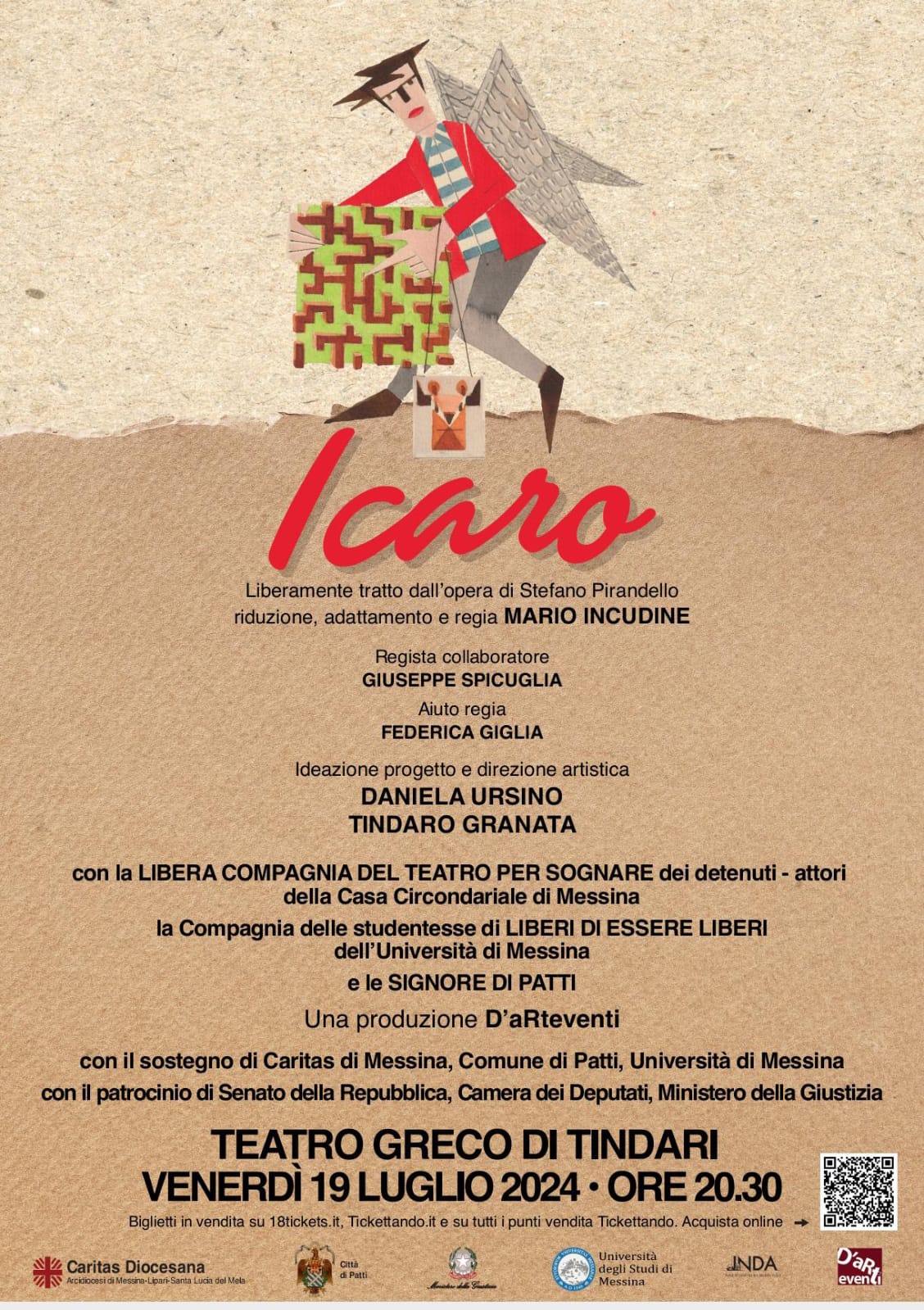 “Icaro” è una produzione di D’aRteventi realizzata con il sostegno della Caritas di Messina, dell’Università di Messina e il Comune di Patti e Fondazione Inda - Istituto Nazionale del Dramma Antico, per il prestito dei costumi di scena.