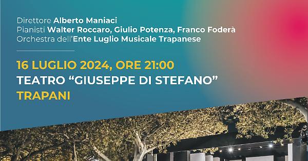 Trapani - Dopo il doveroso omaggio dedicato al centenario della scomparsa del compositore italiano Giacomo Puccini con le prime due recite della "Turandot" di Daniele De Plano, che hanno inaugurato il cartellone estivo della Settantaseiesima Stagione dell'Ente Luglio Musicale trapanese - una delle quali ha fatto registrare il primo sold out del Teatro Di Stefano - tutto è pronto per il secondo il secondo appuntamento di Favole, fiabe e altri racconti. Sempre il Giuseppe Di Stefano, , martedì 16 luglio, alle 21:00, ospiterà il concerto "Omaggio a Francis Poulenc e George Gershwin", pensato per celebrare due grandi figure del Novecento musicale: ricorrono quest’anno, infatti, il 125° anniversario della nascita del pianista francese e i cento anni dell’opera “Rhapsody in Blue” del compositore statunitense. Accompagnati dall’Orchestra dell’Ente Luglio Musicale e diretti da Alberto Maniaci, al pianoforte si esibiranno Walter Roccaro - direttore artistico dell’Ente, in un omaggio gratuito - e il giovane Giulio Potenza, talento italiano riconosciuto a livello internazionale, che eseguiranno Sinfonietta - FP 141 (Allegro con fuoco, Molto vivace, Andante cantabile, Très vite et très gai) e il Concerto per due pianoforti e Orchestra FP 61 (Allegro ma non troppo, Larghetto, Allegro molto) di Poulenc; nonché Franco Foderà che interpreterà la celebre composizione di Gershwin.