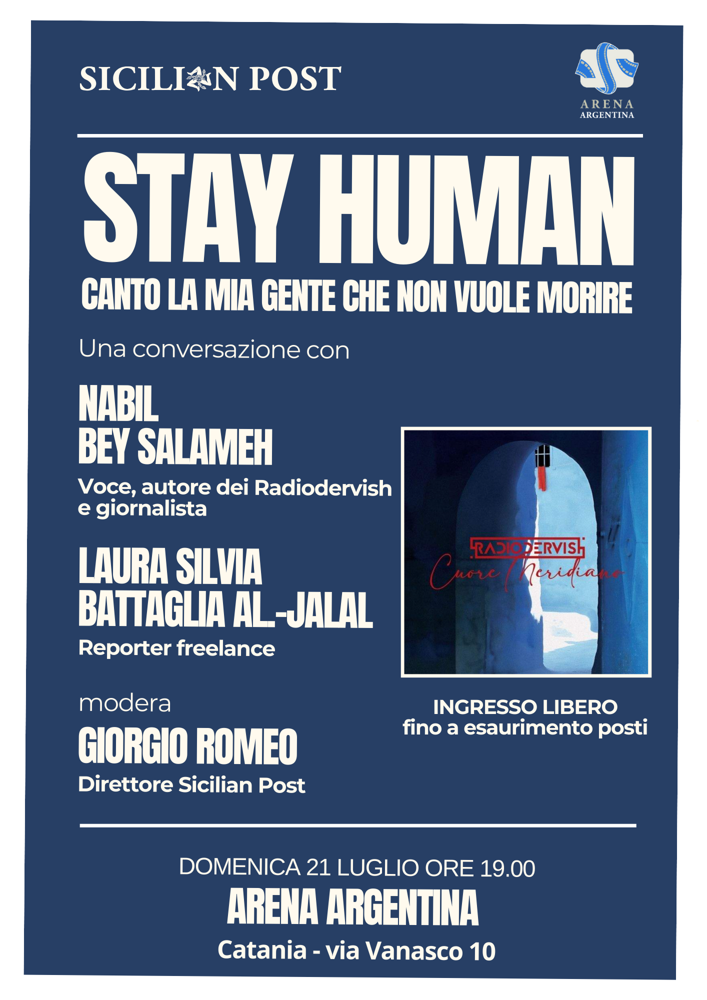 Mentre, a poca distanza da noi, si consuma l’ultimo tragico episodio della storia del popolo palestinese, ritorna prepotente il bisogno di immaginare una realtà diversa. Ma se la buona informazione rappresenta il primo passo per una comprensione di ciò che ci accade intorno, quale può essere il ruolo dell’arte e della musica nel risvegliare una diversa consapevolezza? A discutere di questi temi saranno, domenica 21 luglio a Catania presso l’Arena Argentina alle 19:00, Nabil Bey Salameh – voce, autore dei Radiodervish e giornalista - e la reporter Laura Silvia Battaglia al-Jalal, ultima giornalista straniera entrata a Gaza prima del 7 ottobre 2023. L’incontro, dal titolo “Stay Human”, promosso dal Sicilian Post e da Cinestudio - Arena Argentina, sarà moderato dal direttore della testata Giorgio Romeo ed è a ingresso libero.