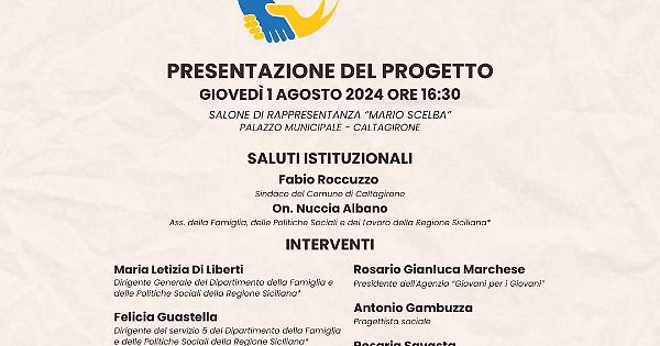 Sarà presentato ufficialmente giovedì 1° agosto, alle ore 16:30, presso il Salone di Rappresentanza "Mario Scelba" del Palazzo Municipale di Caltagirone, il progetto "Giovani in città", avviato dall’Agenzia “Giovani per i Giovani” e promosso dal Ministero del Lavoro e delle Politiche Sociali e dal Dipartimento Regionale della Famiglia e delle Politiche sociali dell'Assessorato della Famiglia, delle Politiche Sociali e del Lavoro dalla Regione Siciliana.