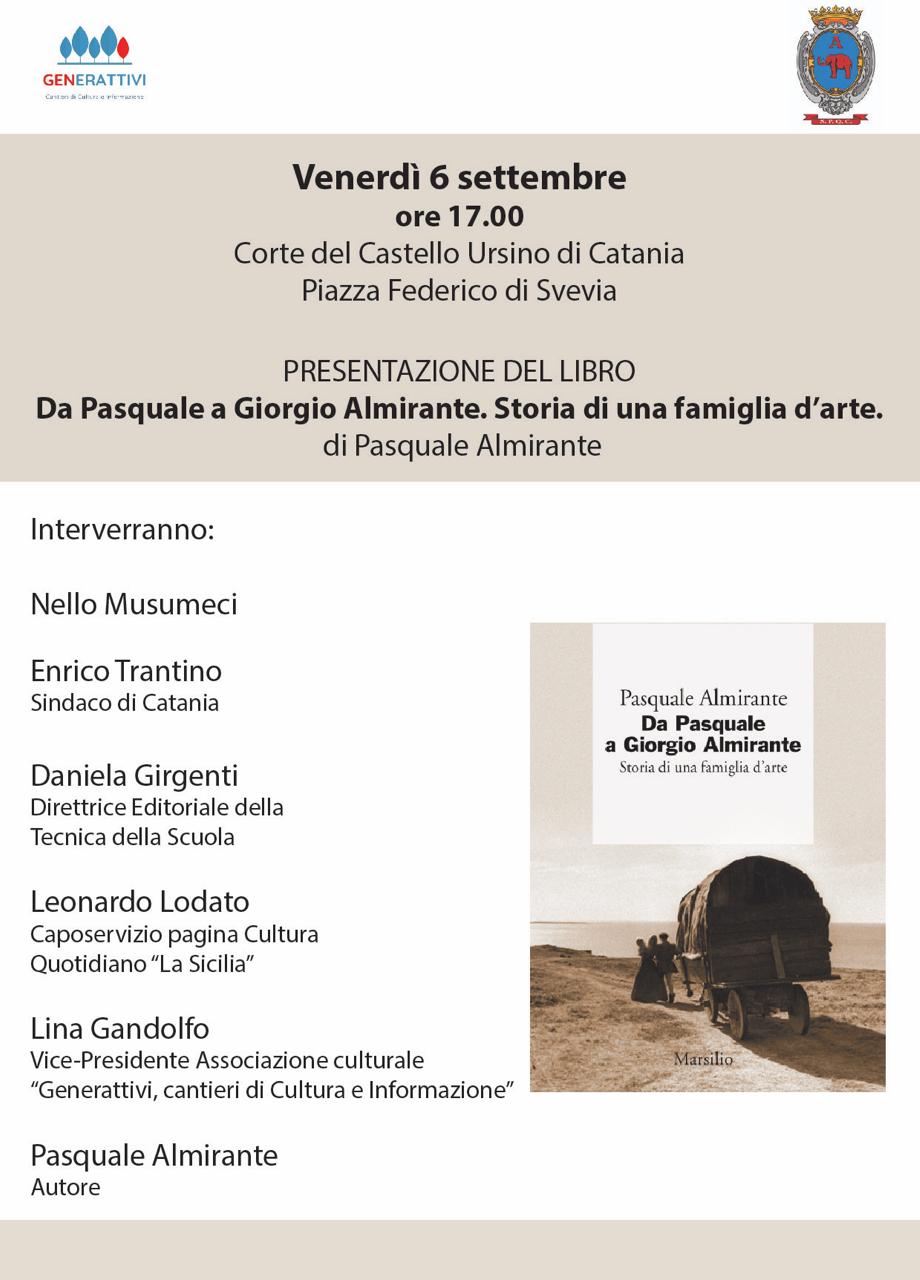 Sarà il ministro Nello Musumeci venerdì 6 settembre, ore 17.00 al Castello Ursino di Catania, a presentare la seconda edizione del libro di Pasquale Almirante, “Da Pasquale a Giorgio Almirante. Storia di una famiglia d’arte” (ed. Marsilio). Interverranno il sindaco della città metropolitana, Enrico Trantino; il giornalista del quotidiano La Sicilia, Leonardo Lodato; e Lina Gandolfo, vicepresidente dell’Associazione culturale “Generattivi”.