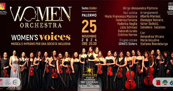 Women Orchestra, Annandrea Vitrano, Stefania Blandeburgo, Cristina Ramos dalla Spagna, Deborah Iurato, Lidia Schillaci, SONG’S Sisters, Maria Francesca Mazzara, Federica Foresta e Federica Neglia. Sono le artiste, tutte donne, che si esibiranno in concerto il prossimo 25 novembre 2024 al Teatro Golden di Palermo. Un’importante iniziativa della Women Orchestra, l’orchestra tutta al femminile nata il 25 novembre del 2017, che per la ricorrenza ha voluto riunire cantanti, musiciste e attrici in Women’s Voices, uno spettacolo all’insegna della musica e dell’impegno a favore di una società inclusiva.