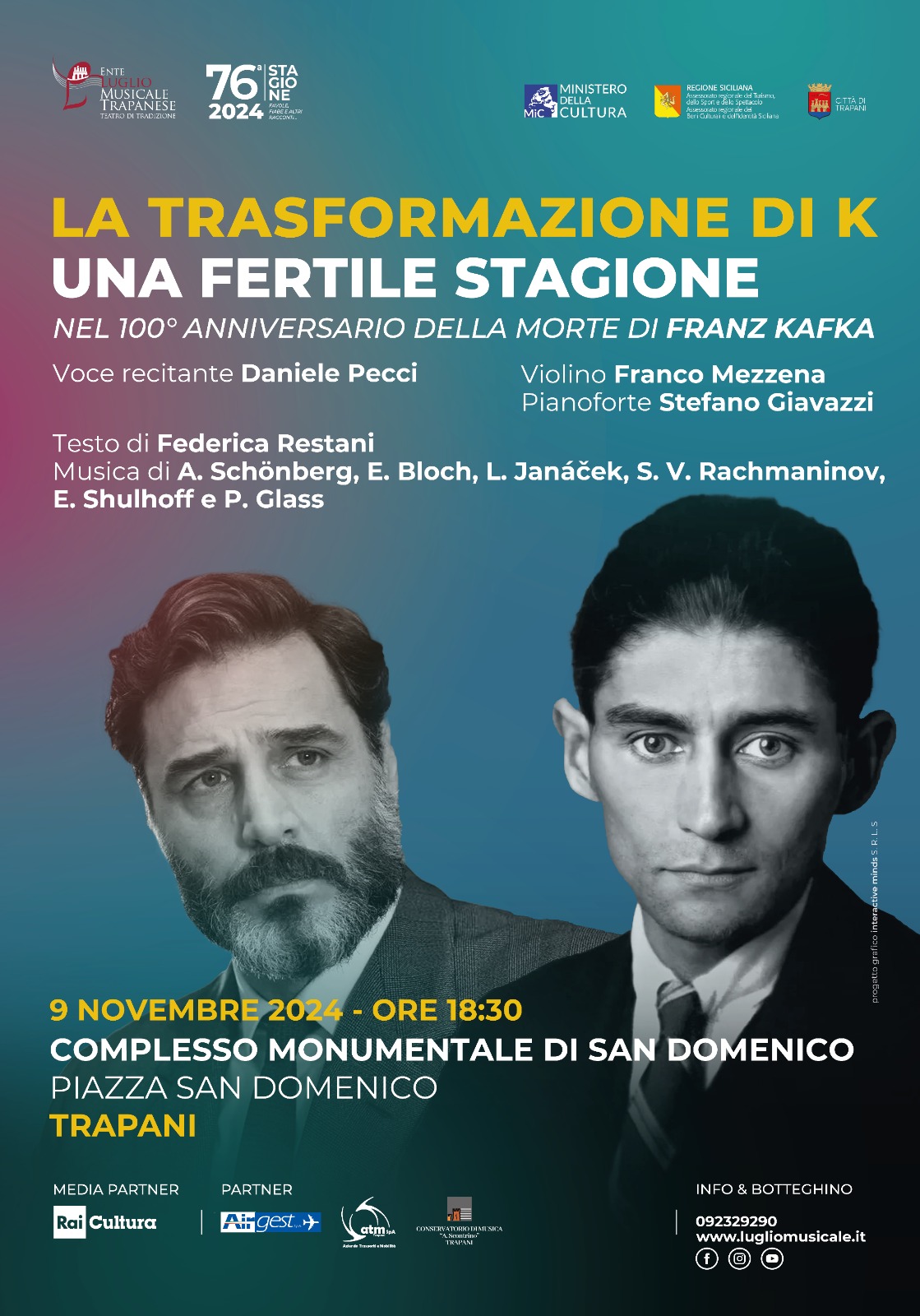 Dove finisce l’uomo e inizia la letteratura? Quanto dell’autore è presente nei personaggi da lui creati? Queste le domande alla base della realizzazione dello spettacolo La trasformazione di K – una fertile stagione, prossimo appuntamento della Stagione autunnale dell’Ente Luglio Musicale. Una performance artistica che mischia letteratura, teatro e musica che sabato 9 novembre vedrà protagonisti il noto attore italiano Daniele Pecci e il celebre duo violino e pianoforte formato da Franco Mezzena e Stefano Giavazzi in un emozionante omaggio allo scrittore ceco Franz Kafka nel centenario della sua scomparsa.