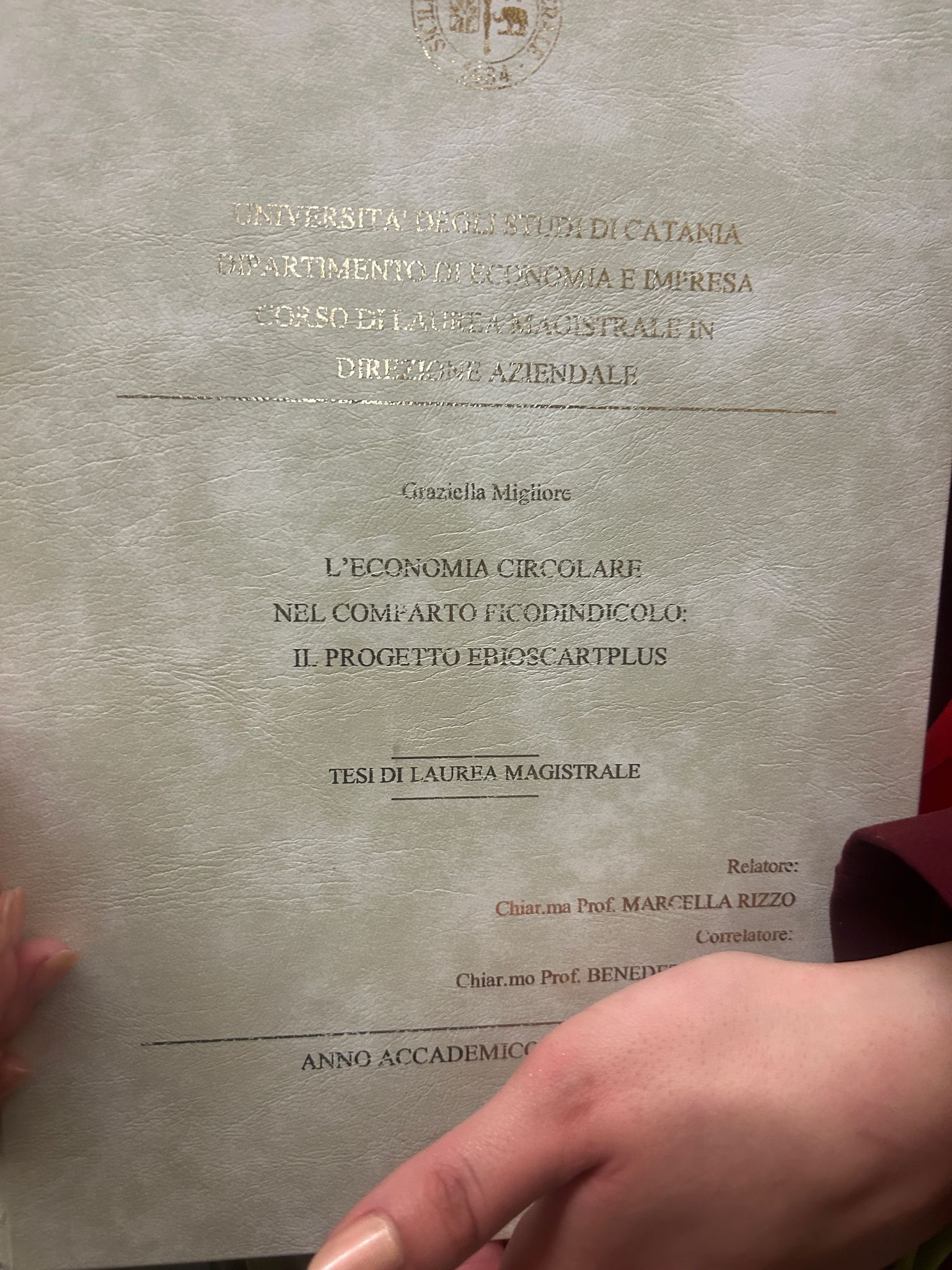 Questo importante traguardo rappresenta il culmine di un percorso accademico che ha saputo coniugare teoria e pratica, grazie anche al suo interesse al progetto europeo EBIOSCART Plus. Un’iniziativa innovativa, EBIOSCART Plus si concentra sul trattamento e la valorizzazione degli scarti derivanti dalla produzione di fichi d'India, una risorsa agricola che, seppur abbondante, viene spesso sottovalutata. Questo progetto ha offerto a Graziella l’opportunità di integrare le sue conoscenze di gestione aziendale con le problematiche ambientali e le dinamiche di mercato legate alla sostenibilità e all’innovazione.