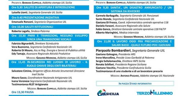 Venerdì 28 febbraio alle 9.30 la tavola rotonda “Sanità, un disastro annunciato. Un sistema da rivedere” (Carmelo Barbagallo segretario Uil Pensionati, Santo Biondo segretario confederale Uil). Alle 11 “Il lavoro di oggi fra preoccupazione e salari bassi. Quale futuro per i giovani. Parteciperà il segretario generale della Uil, Pierpaolo Bombardieri.
