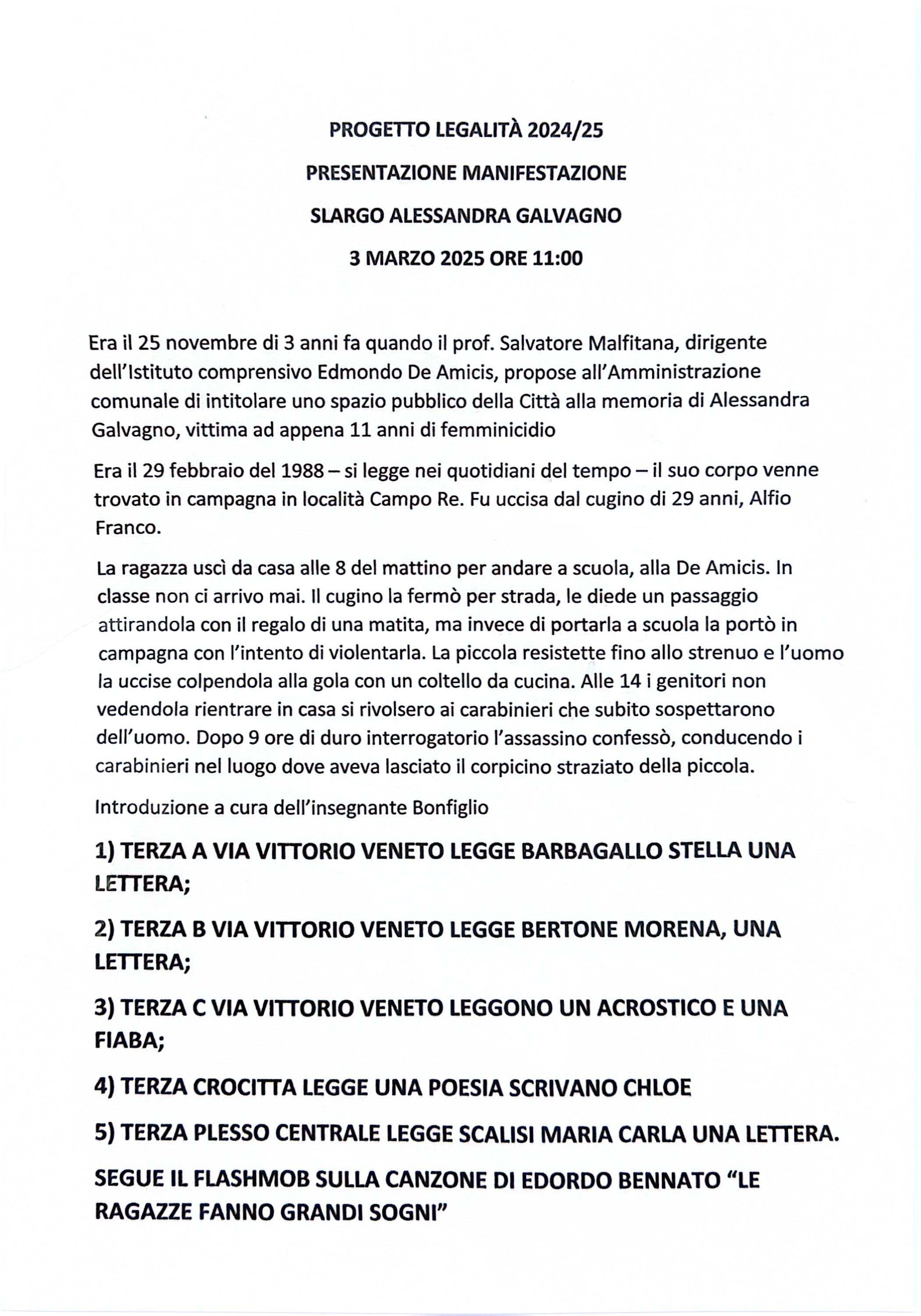 In un giorno toccato dal freddo abbraccio dell'inverno, il 3 marzo 2025, Randazzo si è stretta in un caldo abbraccio comunitario per un evento che ha toccato profondamente il cuore di quanti vi hanno preso parte. Alle 11:00, nell'intimo Slargo Alessandra Galvagno, battezzato in memoria di un'innocenza rubata troppo presto (fu il prof. Salvatore Malfitana, dirigente dell'Istituto Comprensivo Edmondo De Amicis, il 25 novembre di tre anni fa a proporre all’amministrazione comunale di intitolare uno spazio pubblico alla memoria di Alessandra e subito abbracciata con fervore dall'allora Sindaco Francesco Sgroi), si è tenuta la presentazione della manifestazione del progetto Legalità 2024/25. Una celebrazione di speranza e ricordo, orchestrata sotto la guida attenta degli insegnanti tutti.