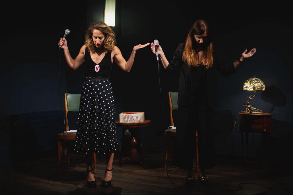 Uno spettacolo teatrale comico, uno stand up atipico, con in scena 2 attrici, 2 sgabelli, 2 microfoni e niente più.
