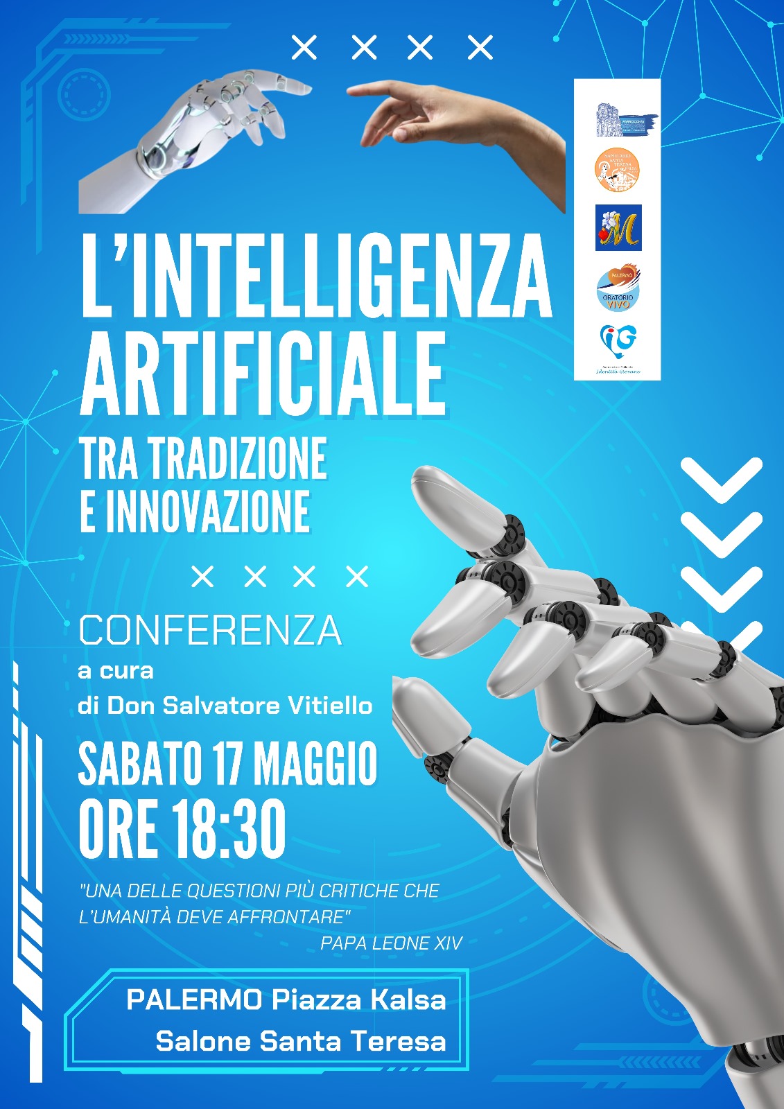 “L’intelligenza artificiale tra tradizione e innovazione”. E’ il tema della conferenza di sabato 17 maggio alle ore 18.30 che si terrà presso il salone del Santuario di Santa Teresa in Piazza Kalsa a Palermo. A parlarne sarà Don Salvatore Vitiello, Docente di teologia fondamentale e dogmatica dell’Università Cattolica del Sacro Cuore. L’incontro è organizzato dalla parrocchia di Santa Maria della Pietà, dalla compagnia dell’Immacolata e San Filippo Neri, Oratorio Vivo e Identità Giovani.