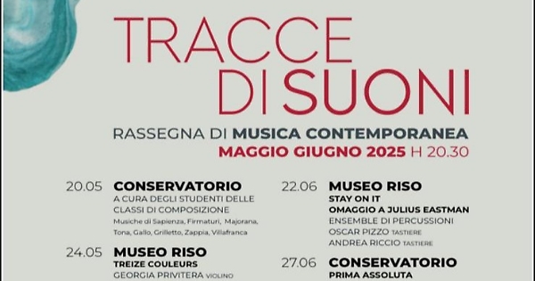 "Tracce di Suoni" 2025, giunto alla quarta edizione, propone, sguardi differenti e molteplici collaborazioni. Un invito a pensare, creare e percorrere nelle più diversificate direzioni, ponti emozionali, disegnando piccoli segmenti nell'immaginare e proporre visioni sognate e curate con passione, tenacia e dedizione. Collage di pensieri, tracce appunto, segni indelebili per costruire e conservare memoria. La Rassegna inizia il 20 maggio alle ore 20.30 presso la Sala Ferrara del Conservatorio di Palermo ad ingresso libero sino ad esaurimento posti.