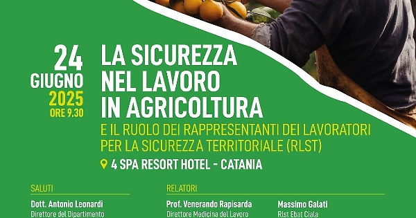 Un confronto ad ampio raggio sulla sicurezza nel lavoro agricolo e sul ruolo chiave dei Rappresentanti dei Lavoratori per la Sicurezza Territoriale (RLST): è questo il cuore del convegno promosso da Ebat Ciala Catania, in programma martedì 24 giugno alle ore 9.30 al 4 Spa Resort Hotel di Catania. L’iniziativa, patrocinata dall’Asp di Catania, dall’Inail – Direzione territoriale Catania, dall’Università degli Studi di Catania, dalla Società Italiana di Medicina del Lavoro. Sez. Siculo-Calabra, dall’Ordine degli Agronomi e Forestali e dall’Ordine dei Consulenti del Lavoro di Catania, vedrà la partecipazione delle principali organizzazioni datoriali e sindacali del comparto: Confagricoltura, Coldiretti, Cgil, Cisl, Uila e Fai Cisl. Ad aprire i lavori, con i saluti istituzionali, saranno: Antonio Leonardi, direttore del Dipartimento di Prevenzione ASP di Catania, Giovanni Greco, presidente dell’Ordine dei Consulenti del Lavoro di Catania, e Claudio Vadalà, dell’Ordine degli Agronomi e Forestali. A seguire, gli interventi degli esperti e professionisti: Venerando Rapisarda, direttore di Medicina del Lavoro presso l’Università di Catania, Santo De Luca, direttore Spresal Asp di Catania, Mario Lombardo, RSPP Confagricoltura, Massimo Galati, RLST Ebat Ciala, Eugenia Elena Cosentino, titolare azienda agricola S.S. A La Rena di Cosentino, e Diana Artuso, direttore Territoriale Inail Catania.