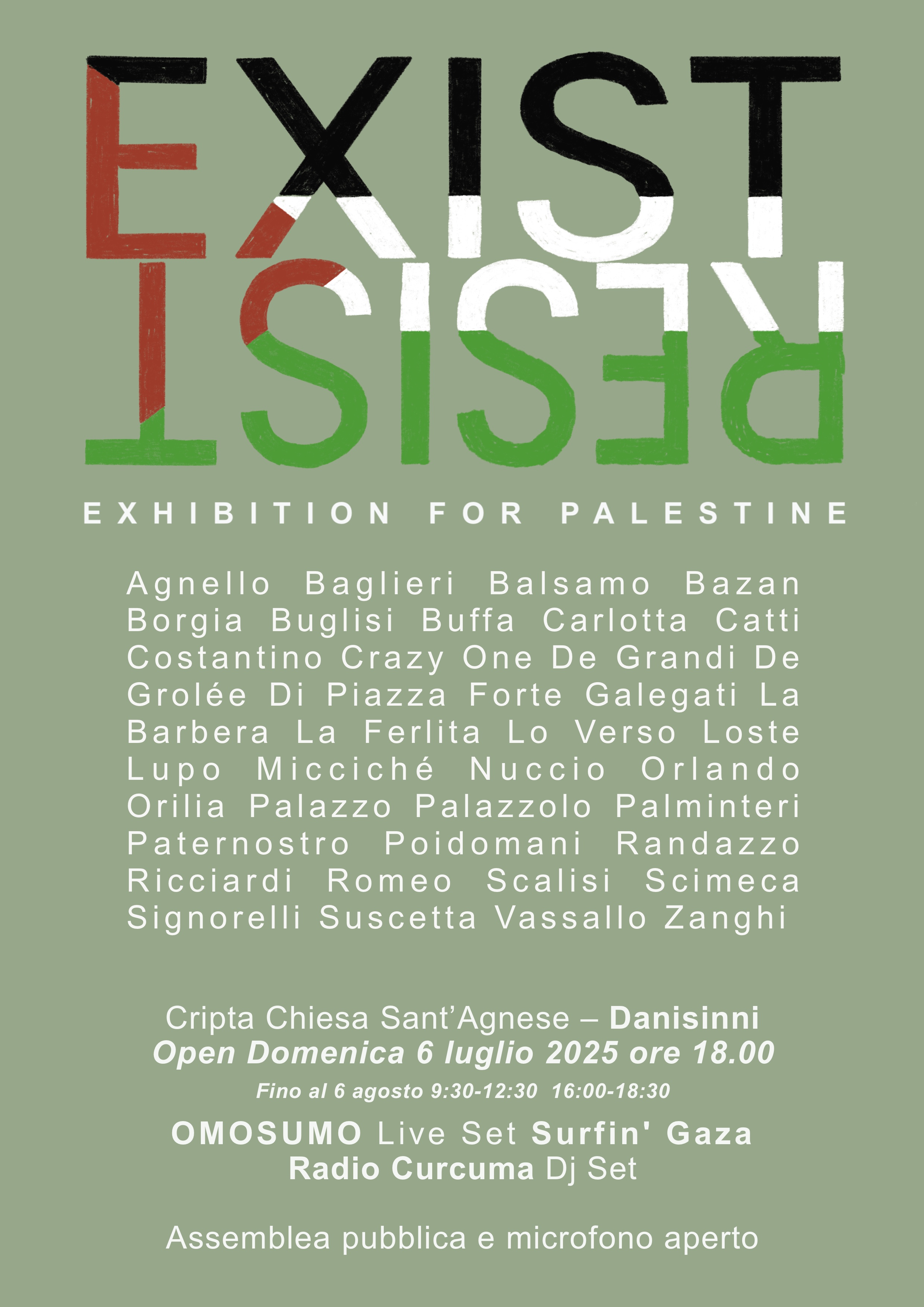 Domenica 6 luglio 2025 alle ore 18, nella Cripta della Chiesa di Sant’Agnese a Danisinni, cuore fragile e pulsante di Palermo, si inaugura EXIST RESIST, mostra collettiva nata per sensibilizzare visitatori e visitatrici, cittadini e cittadine sul genocidio di cui è vittima il popolo palestinese.