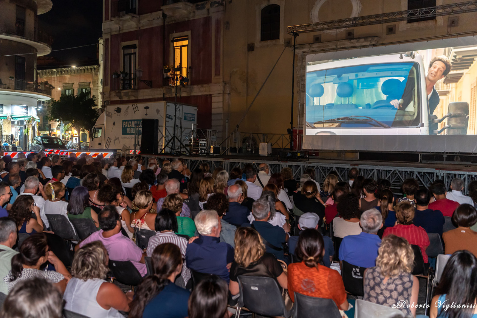 Prima della proiezione, Ornella Sgroi - che ha curato la direzione artistica della rassegna di Buongiorno Sicilia in piazza Federico II a Catania – ha intervistato sul palco Gino Astorina, Nuccio Morabito e Luciano Messina. Le risate del pubblico per i divertenti aneddoti riguardanti le esperienze dei tre cabarettisti catanesi in diversi film di Salvo Ficarra e Valentino Picone. La presenza tra il pubblico del sindaco di Catania Enrico Trantino e del vicesindaco Paolo La Greca e la volontà dell’Amministrazione comunale di coniugare intrattenimento e cultura identitaria.