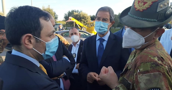 CATANIA - Quando Ruggero Razza - figlio di generale dei carabinieri, giovane allievo della Nunziatella prima di fare l’avvocato e, infine, l’assessore alla Salute - non riesce a trattenere un lungo sguardo d’ammirazione su quel fregio militare in bella mostra sulla divisa, la scintilla istituzionale è già scoccata da un po’. In pochi capiscono il valore del “9° Col Moschin” e Francesco Paolo Figliuolo ricambia con un sorriso compiaciuto. «Anch’io so chi è lei, chi siete voi. State facendo un buon lavoro, io sono qui affinché si faccia ancora meglio», scandisce il commissario nazionale al PalaRegione di Catania prima di intrattenersi per quasi un’ora con Nello Musumeci.