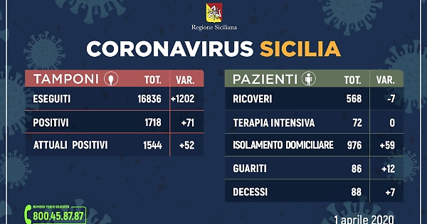 Questo il quadro riepilogativo della situazione nell’Isola, aggiornato alle ore 17 di oggi (mercoledì 1 aprile), in merito all’emergenza #Coronavirus, così come comunicato dalla Regione Siciliana all'Unità di crisi nazionale.