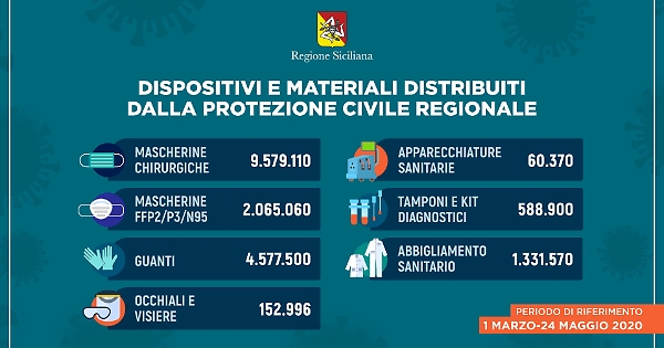 La Regione Siciliana ha distribuito dal primo marzo a ieri oltre 18 milioni di dispositivi di protezione individuale e apparecchi sanitari. Lo ha reso noto l'ufficio stampa del presidente della Regione. I dpi sono stati consegnati a strutture sanitarie, case di riposo per anziani, residenze sanitarie assistite, Comuni, Prefetture, Forze dell'Ordine, Esercito, ex Province, carceri, dipartimenti regionali, Confcommercio e Confesercenti.