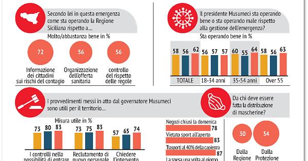 Musumeci «sta operando bene» per quasi due cittadini su tre; giudizi più positivi fra uomini, fascia d’età 35-54 anni e residenti nel Catanese. Ma il consenso cresce quando si entra nel merito delle misure attuate o chieste: stretta nei controlli per chi entra in Sicilia e assunzioni di personale sanitario (gradimento per entrambi salito dal 73 all’83% in tre settimane) e richiesta dell’Esercito per contrastare gli arrivi (dal 57 al 74%).