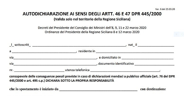 Ecco il modulo per l'autocertificazione (SCARICALO QUI)per gli spostamenti in Sicilia secondo quanto previsto dal decreto del presidente del Consiglio e dall'ordinanza del governatore siciliano.