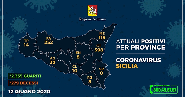Palermo - Questi i casi di coronavirus riscontrati nelle varie province dell'Isola, negli ultimi due giorni (11 e 12 giugno), aggiornati alle ore 15 di oggi, così come segnalati dalla Regione Siciliana all'Unità di crisi nazionale. Questa la divisione degli attuali positivi nelle varie province: