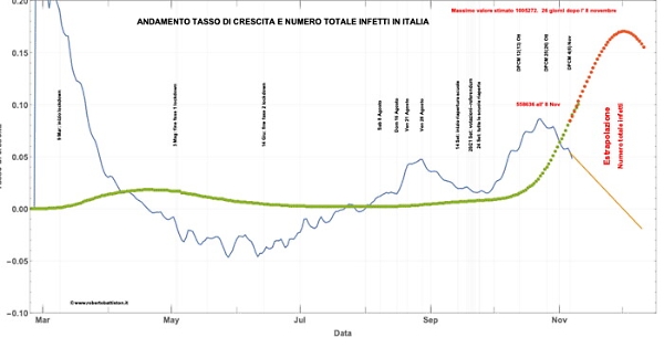 «Usando i dati disponibili per calcolare il tasso di crescita - ha detto Battiston all’ANSA - possiamo estrapolare l'andamento del totale del numero degli infetti attivi nel corso delle prossime settimane. Se l’attuale tendenza di riduzione del tasso di crescita si mantiene, e il Dpcm degli inizi di novembre dovrebbe contribuire in tal senso, si prevede che a livello nazionale si raggiunga il picco agli inizi di dicembre per poi iniziare a scendere». Tuttavia, ha aggiunto, «la situazione deve essere continuamente monitorata per una ottimale gestione delle risorse sanitarie del Paese». Per Battiston «una crescita esponenziale come quella di ottobre non si sarebbe potuta gestire a lungo» e le misure previste nei due Dpcm di ottobre, fortunatamente, sembrano avere ottenuto l’effetto di invertire l’andamento del tasso di crescita», mentre gli effetti dell’ultimo Dpcm si vedranno a partire dal 14-15 novembre. Le stesse considerazioni si possono fare per le singole regioni, ognuna delle quali mostra una dinamica diversa.
