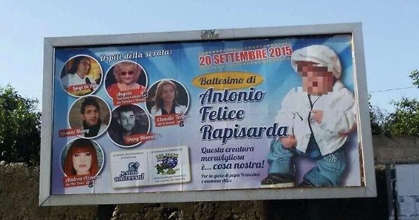 CATANIA - A settembre dello scorso anno aveva annunciato il battesimo del proprio figlio pubblicizzandolo con due manifesti sei metri per tre, assieme a una festa con cantanti neomelodici, spiegando che "Questa creatura meravigliosa è... cosa nostra", insieme a una foto che ritraeva il piccolo con una coppola bianca. Oggi Francesco Rapisarda è agli arresti domiciliari per un furto con "spaccata" in un'area di servizio di Giarre, nel Catanese, paese dove si sarebbe dovuta tenere la festa che fu poi rinviata.