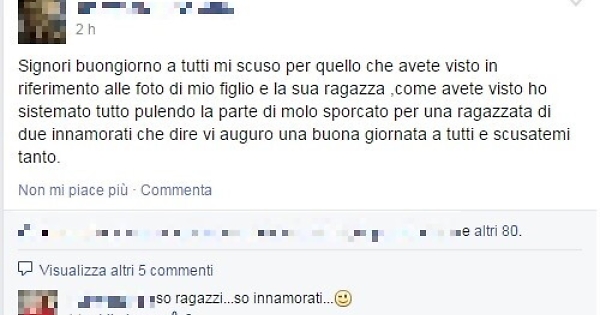Ieri è però arrivata la sorpresa: il padre del ragazzo, noto perché gestisce uno storico chiosco nella località balneare agrigentina, è andato sul posto e ha ripulito muri e selciato cancellando le scritte e “ripristinando” come ha potuto i luoghi. L’annuncio è arrivato peraltro su Facebook e sulla pagina #agrigentomanifesta la piazza virtuale dove erano giunte le critiche più feroci: “Mi scuso per quello che avete visto in riferimento alle foto di mio figlio e la sua ragazza, come avete visto ho sistemato tutto pulendo la parte di molo sporcato per una ragazzata di due innamorati. Buona giornata a tutti e scusatemi tanto”.