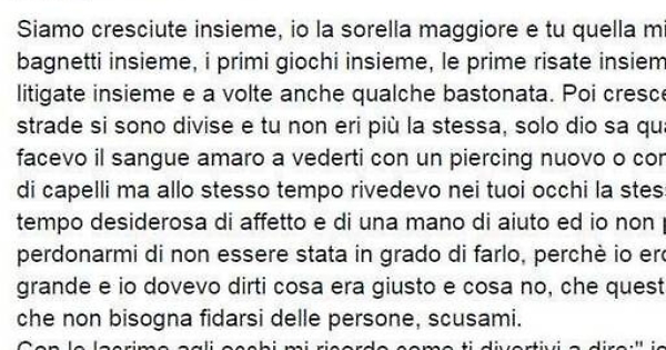 Samantha Boemi, sorella di Ilaria, 16 anni, trovata morta l’altro ieri notte a Messina sulla spiaggia del lungomare del Ringo, su facebook la ricorda commossa dopo aver postato una foto con lei quando erano piccole mano nella mano. «Siamo cresciute insieme, - scrive Samantha - io la sorella maggiore e tu quella minore. I primi bagnetti insieme, i primi giochi insieme, le prime risate insieme, le prime litigate insieme e a volte anche qualche bastonata. Poi crescendo le nostre strade si sono divise e tu non eri più la stessa, solo Dio sa quante volte mi facevo il sangue amaro a vederti con un piercing nuovo o con un nuovo colore di capelli ma allo stesso tempo rivedevo nei tuoi occhi la stessa bambina di un tempo desiderosa di affetto e di una mano di aiuto ed io non potró mai perdonarmi di non essere stata in grado di farlo, perchè io ero quella più grande e io dovevo dirti cosa era giusto e cosa no, che questa vita fa schifo e che non bisogna fidarsi delle persone, scusami. Con le lacrime agli occhi mi ricordo come ti divertivi a dire: io sono sua zia e anche se era la verità per me eri e resterai per sempre la mia sorellina minore».
