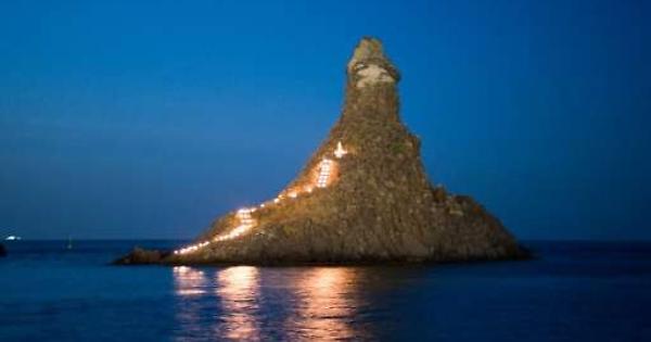 E poco a poco, nel buio della notte, la lenta accensione delle fiaccole creò uno sfavillante sentiero: dagli scogli del mare, che circonda il più alto dei Faraglioni, fin lassù quasi in cima dove domina, ormai da più di 60 anni, l'immagine della Madonna. Tante sono state le escursionipellegrinaggio, magari a piedi nudi, in tutti questi anni fra preghiere e richieste fra le più disparate espresse dal mazzo di fiori delle coppie di sposi o dai canti dei bambini sognanti dopo aver attraversato quel mare che magari da terra, mostrando le sue onde, li aveva fatti spaventare.