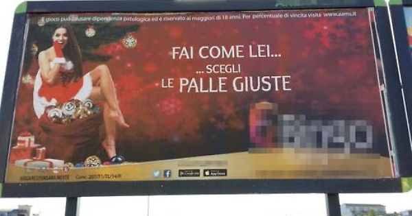 In principio furono le “mozzarelle”, la pubblicità che paragonava un seno a due mozzarelle di una nota azienda casearia, fasciate in un bikini con la stessa fantasia delle confezioni di latticini che si trovavano sui banchi frigo. Da allora tante immagini sessiste in pubblicità, sono passate sui manifesti cittadini, dai sederi da rifare («Lo vuoi così? Chiamami e ti dirò come fare», alle varie gelaterie che più che il gelato reclamizzano le labbra, ovviamente aperte, della ragazza che lo mangia). Adesso parliamo di “palle” ma sempre con una donna in primo piano. E’ l’ultima «originalissima» campagna pubblicitaria sessista, spalmata sui cartelloni di tutta Catania, dall’aeroporto a via Vincenzo Giuffrida. L’immagine, segnalataci anche da diverse lettrici, è quella di una ragazza vestita da babbo natale sexy (perché notoriamente sotto Natale ci si mette un microvestitino rosso bordato di pelliccia bianca a spalle scoperte) che, a piedi nudi, sorride sorpresa davanti ad un sacco pieno di palline numerate. Lo slogan recita: «Fai come lei... scegli le palle giuste». Cosa pubblicizza? Ma ovviamente, una sala bingo. Ogni commento è superfluo. Ci limitiamo a segnalare la pubblicità in questione all’assessora alle Pari Opportunità Valentina Scialfa che due anni fa ha voluto un regolamento per eliminare la pubblicità sessista dai manifesti.