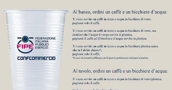 Parte dalla raccolta differenziata il presidente Fipe Bar del Sistema Confcommercio Massimo Magrì per arrivare alla ultimamente discussa questione del pagamento del bicchere di plastica con acqua. Un provvedimento adottato dall'assemblea di Confcommercio e che scatterà a partire dal prossimo 1 giugno.  L'aqua richiesta al banco di bar o in altri esercizi commerciali simili servita nel bicchiere di plastica si pagherà, a discrezione dell'esercente, 10 centesimi (ordinando un caffè, non si pagherà il bicchere soltanto se è l'esercente ad offrirlo). Magrì però precisa: «nessuno di noi ha mai parlato di far pagare l'acqua, ma l'inutile bicchiere di plastica. Che senso ha prendere un caffè in tazza o un aperitivo in vetro e poi chiedere un bicchiere di acqua in plastica? Riteniamo sia solo un inutile spreco. Se si decide di entrare in un locale che somministra cibi e bevande, si decide di fidarsi dei prodotti usati, della loro qualità ma soprattutto della pulizia e dell’igiene degli ambienti e strumenti di lavoro. Allora tutto dovrebbe essere servito in plastica! Un servizio da distributore automatico che il solo bicchiere di plastica vuoto te lo fa pagare 5/10 cent».