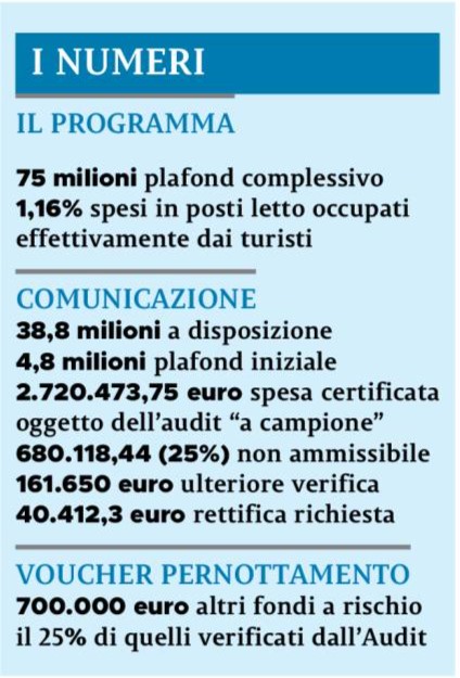 Si tratta di una verifica effettuata dall’ufficio, afferente alla Presidenza della Regione, che ha il compito di vigilare sui programmi cofinanziati dalla Commissione europea. Così come avviene per tutti gli altri fondi Ue, l’Autorità ha svolto dei controlli a campione. Su una minima parte delle risorse gestite dal Turismo con SeeSicily”: 2.720.473,75 euro sul plafond complessivo di 75 milioni presi dal Fesr, di cui 28,8 milioni (all’inizio erano appena 4,8) infine destinati a «promozione e monitoraggio». Il risultato del “blitz”, relativo proprio a questo capitolo, non lascia molti margini di dubbio: «La spesa non ammissibile, che concorrerà al tasso di errore da rettificare nell’ambito della chiusura dei conti del periodo contabile 2021/2022, ammonta a 680.118,44 euro», pari al «25% della spesa certificata oggetto di audit».