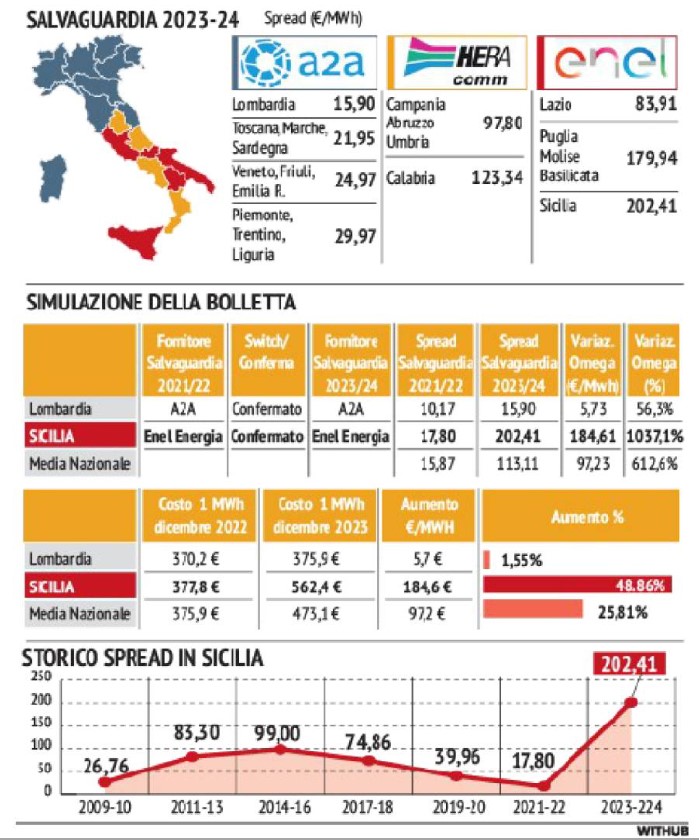 Il deputato di FdI aggiunge: «Il fatto ancora più eclatante è un altro. Perché se da un lato avremo l’obbligo di acquisto a 27,80 euro MW/h a regime ordinario, col meccanismo di salvaguardia che scatta per quei comuni che sono in ritardo o sono morosi, non potendo staccare la corrente elettrica perché si tratterebbe di interruzione di pubblico servizio, il fornitore è costretto ad erogare energia, ma lo farà in regime di salvaguardia, ovvero ad oltre 200 euro a MW/h. La cosa ancora più grave tuttavia è che il gestore dell’energia elettrica in regime ordinario, Enel Energia, e il gestore del regime di salvaguardia, coincidono». Se già all’indomani di un mancato pagamento da parte di uno dei nostri comuni siciliani, Enel Energia decidesse di applicare il regime di salvaguardia, facendo schizzare il costo da 27,80 a 202 euro a MW/h, «quei comuni andrebbero in default: una tale situazione rischia di avere effetti devastanti per i comuni e non solo per loro, perché per far quadrare i bilanci i sindaci saranno costretti ad aumentare le tassazioni ai propri cittadini, o dovrà essere la Regione a intervenire».