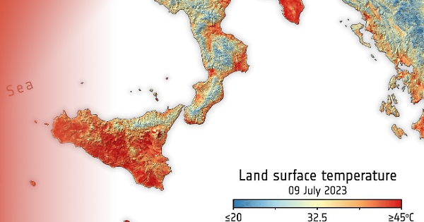 Sono giorni di calco record in tutta Italia a causa dell'anticilone Cerbero e in Sicilia le temperature della superficie terrestre sulle pendici dell’Etna in Sicilia tra il 9 e il 10 luglio hanno superato i 47 gradi. Lo dimostra un’animazione della missione Sentinel-3 del programma di osservazione satellitare della Terra Copernicus, gestita dall’Agenzia Spaziale Europea (Esa) e dalla Commissione Ue. Rilevata la stessa temperatura al suolo anche in Puglia.