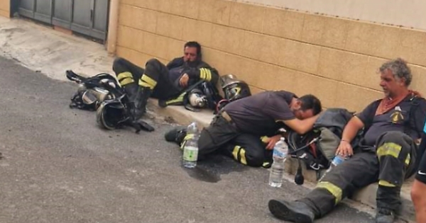 Quei vigili del fuoco a terra, stanchi e distrutti, ridotti allo stremo, esausti dopo turni massacranti per fronteggiare i roghi che hanno bruciato la Sicilia in questi giorni. E' l'immagine simbolo di questa emergenza incendi, arriva da Carlentini, Siracusa, ma potrebbe essere ovunque nell'Isola dove negli ultimi giorni i pompieri sono stati chiamati a un superlavoro.