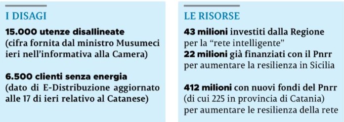 Qui s’impongono alcuni interrogativi. A che punto sono gli 11 interventi pagati dalla Regione? Qual è il piano operativo con i 22 milioni del Pnrr e cosa prevedeva il secondo elenco non finanziato? E infine qual è il dettaglio del Piano di Resilienza 2022-24 di E-Distribuzione in Sicilia? A queste tre domande l’azienda risponde in modo generico: «Gli investimenti sulle reti sono costanti e, nei prossimi due anni, saranno 412 milioni di euro del Piano Nazionale Ripresa e Resilienza quelli investiti dalla società per il potenziamento e l'adeguamento della rete elettrica. Anche la provincia di Catania è inserita a pieno titolo nel Pnrr con una previsione di spesa di 225 milioni di euro (dei 412 stanziati) per l’aumento della resilienza della rete alle ondate di calore e della capacità di accogliere l’energia prodotta da impianti a fonte rinnovabile». Il tutto, rivendica, E-Distribuzione, assicurando « il suo impegno vigoroso e costante nel continuare ad operare per rendere sempre più resilienti le reti elettriche, intervenendo in costante coordinamento con le istituzioni locali, le Prefetture e la Protezione civile regionale». A proposito: il 3 agosto è fissato incontro fra i vertici del gruppo Enel e l’assessore regionale all’Energia, Roberto Di Mauro. Magari sarà un’occasione per chiarire meglio cos’è successo in questi giorni e quali sono le prospettive dei progetti in Sicilia.