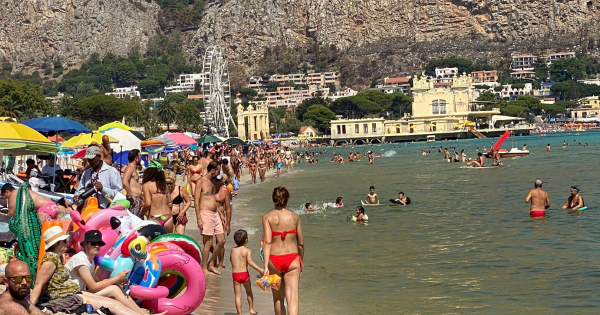 Gruppetti di persone passeggiano nei centro storici di Taormina, Siracusa, Ragusa Ibla, Palermo e Catania ma siciliani e turisti sono tutti al mare nelle isole Egadi e Eolie a Lampedusa e Pantelleria mentre è stracolma di gente la spiaggia palermitana di Mondello dove l’acqua però oggi non è caraibica come la maggior parte della stagione.