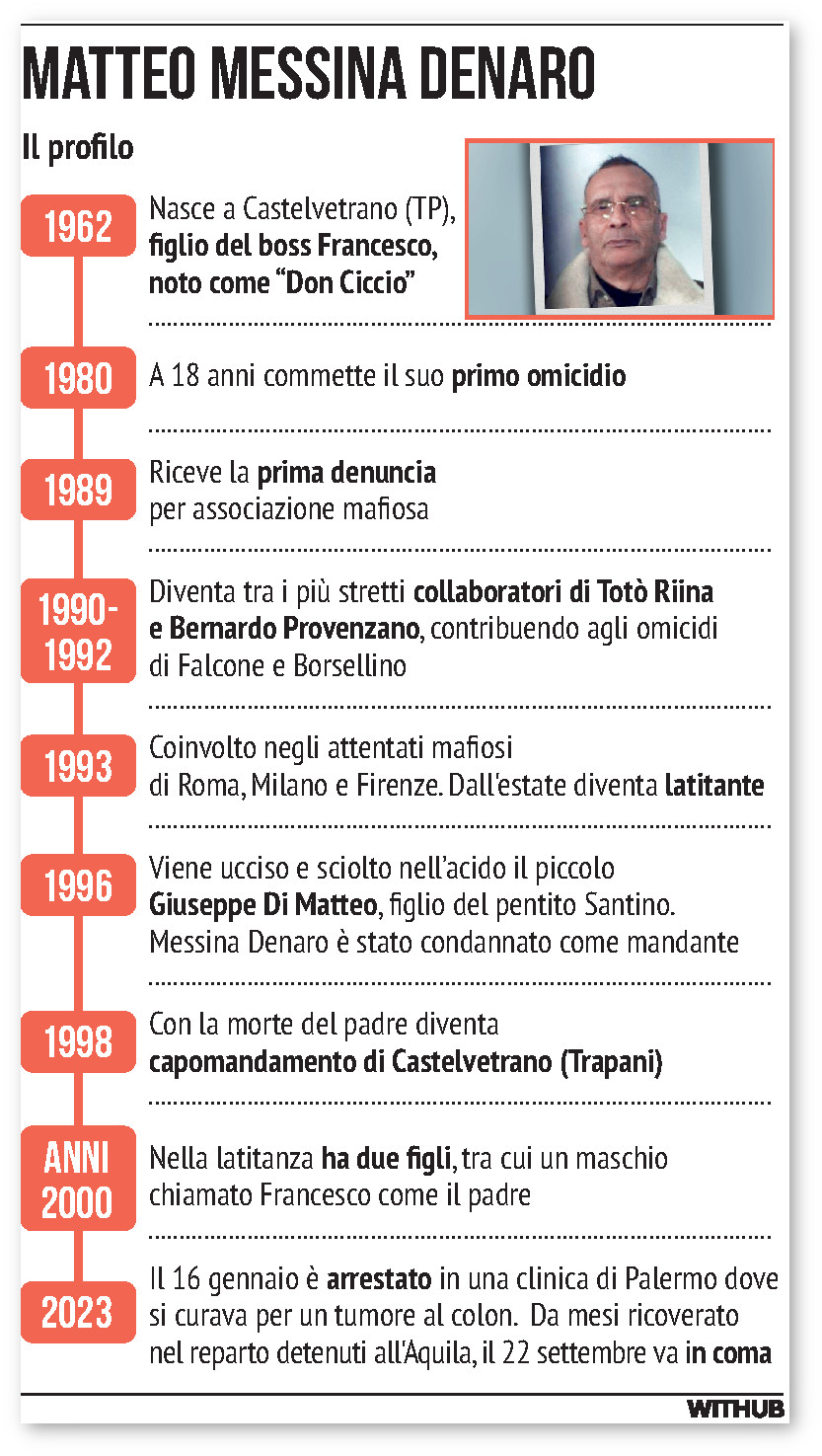 Nel supercarcere dell’Aquila è entrato poche ore dopo l’arresto. La Procura di Palermo ha subito chiesto e ottenuto per lui il 41 bis. Era il 16 gennaio, il giorno in cui è terminata la trentennale latitanza del boss Matteo Messina Denaro. Dal blitz dei carabinieri del Ros, scattato poco prima che il capomafia si sottoponesse sotto falsa identità alla chemioterapia in una clinica di Palermo, sono trascorsi quasi nove mesi. Oggi con la sua morte, ormai da settimane in condizioni gravissime e da venerdì in coma irreversibile, è calato il sipario sulla storia dell’ultimo stragista di Cosa Nostra.