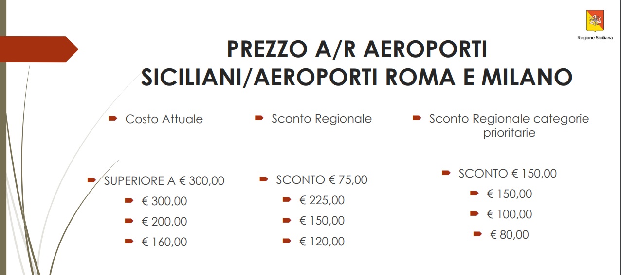 Domani la Regione pubblicherà il bando per raccogliere le adesioni delle compagnie aree; l’avviso rimarrà aperto per dieci giorni, poi dal primo dicembre partiranno gli sconti. L'abbattimento del 25% sarà per tutti i residenti in Sicilia e potrebbe scattare già al momento della prenotazione dalle piattaforme delle compagnie che aderiranno, l’ulteriore 25% invece è destinato alle categorie deboli; in quest’ultimo caso se le compagnie non accetteranno l’autocertificazione al momento della prenotazione sarà direttamente la Regione a gestire le richieste di rimborso attraverso un proprio portale.
