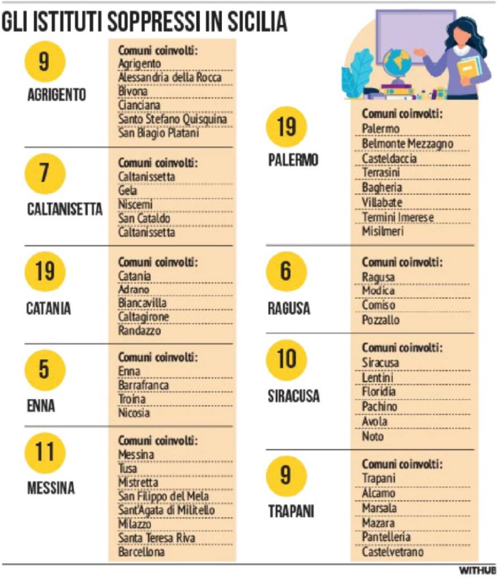 A partire dal numero magico (o tragico, in base ai punti di vista) venuto fuori ormai ufficialmente: 95. Sono le dirigenze - di fatto gli istituti - da sopprimere a partire dall’anno scolastico 2024/25. Questa la distribuzione su base provinciale: 19 a testa per Palermo e Catania, 11 a Messina, 10 a Siracusa, 9 sia ad Agrigento sia a Trapani, 7 a Caltanissetta, 6 a Ragusa e 5 a Enna. Sul totale di 95 ci potrebbe essere una minima riduzione per arrivare alle 93 soppressioni espressamente richieste da Roma.