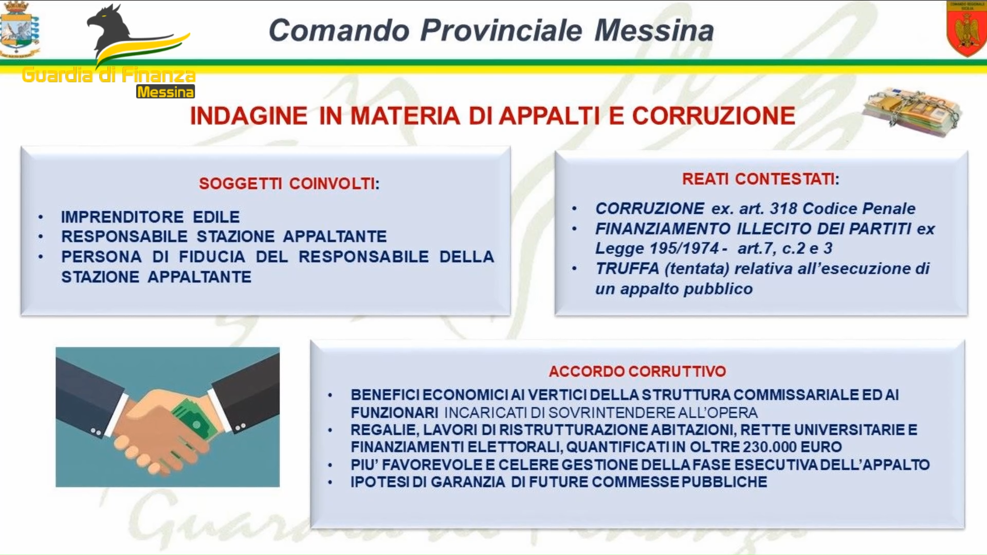 La struttura del Commissario del Governo per il dissesto idrogeologico, compreso il verticie e cioè Maurizio Croce, completamente asservita all’imprenditore che si occupava dei lavori di riqualificazione ambientale e risanamento igienico dell’alveo del torrente Cataratti – Bisconte e di altre opere varie nel Comune di Messina. Nelle carte della Procura di Messina - che ha chiesto ed ottenuto dal gip del Tribunale tre misure cautelari a seguito delle indagini del del Comando Provinciale della Guardia di Finanza di Messina – ci sono dazioni di denaro che vanno dalla ristruttarazioni di case dei privati (fino a 80 mila euro), a contributi elettorali (anche di 60 mila euro), il pagamento di spese universitarie e persino un Rolex Daytona da 20 mila euro.
