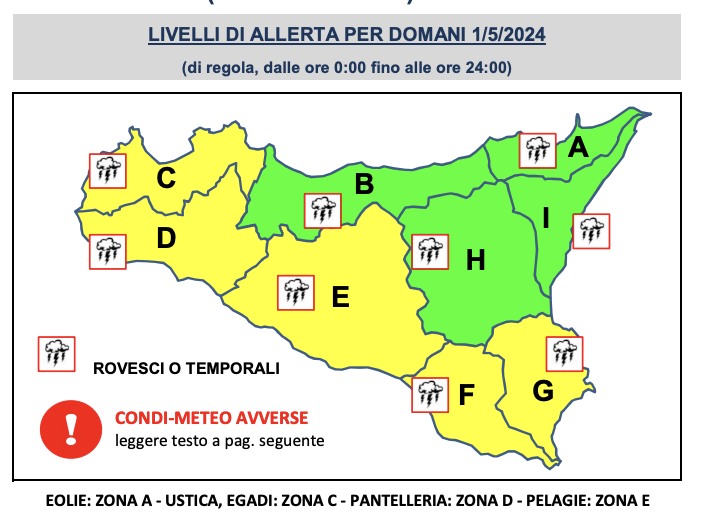 L’avviso prevede dalla sera di oggi, martedì 30 aprile, precipitazioni, anche a carattere temporalesco, su Valle d’Aosta, Piemonte, Toscana, Umbria, Marche, Lazio, Abruzzo, Molise, Campania e Sicilia, con valori cumulati da moderati fino a localmente elevati su Valle d’Aosta orientale e Piemonte settentrionale. Sulla base dei fenomeni previsti e in atto è stata valutata per la giornata di domani, mercoledì 1 maggio, allerta gialla in Toscana, Umbria, Marche, Lazio, Campania e su buona parte di Valle d’Aosta, Piemonte, Abruzzo, Molise e Sicilia.