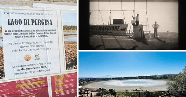 Sono gli inizi degli anni '60, nel video scorrono immagini del Gran Premio con centinaia di persone assiepate sulla tribuna e nella conca pergusina. A fare da sfondo il lago, rigoglioso e pieno d’acqua. Un documento che i due registi, dopo averlo digitalizzato, hanno condiviso sui social per denunciare lo stato in cui oggi il lago si trova.