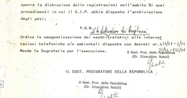 Siamo all’inizio del mese di giugno del 1992. L’autostrada per Capaci è un cratere aperto, il puzzo della strage ancora stravolge i superstiti, i corpi di Giovanni Falcone, della compagna e degli agenti di scorta giacciono già al cimitero mentre Paolo Borsellino freme. Vuole andare a Caltanissetta a raccontare perché Giovanni Falcone è stato ucciso. Sono giornate convulse per lui mentre negli uffici di Palermo si consuma un altro giallo. «Ordina la smagnetizzazione dei nastri relativi alle intercettazioni telefoniche o ambientali disposte» nel 91 e nel 92. È quanto battuto a macchina e firmato dall’allora sostituto procuratore Gioacchino Natoli in merito all’attività investigativa compiuta tra Palermo e Massa Carrara dove una cellula imprenditore palermitana si era insediata. Spunta anche che a penna è stato aggiunto: «e la distruzione dei brogliacci».