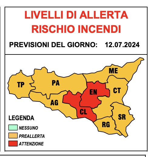 La Sicilia resta in questi giorni nella morsa dell'afa e la Protezione civile regionale ha pubblicato l’avviso per rischio incendi e ondate di calore, per domani e per le successive 24 ore. Sono previsti per gli incendi un livello di preallerta classificato come arancione in tutte le province tranne Enna e Caltanissetta dove il livello di allerta è alto ed è classificato come rosso. La temperatura massima percepita sarà tra i 34 e i 35 gradi a Palermo, Catania e Messina.