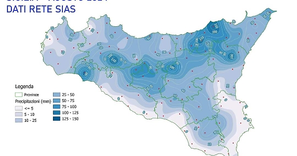 Non si tratta di un valore eccezionale, tenendo conto che basta andare al 2022 per incontrare valori superiori; l'agosto più piovoso per la Sicilia resta quello del 2018, quando media regionale fu di 92 mm e durante il mese solo 2 giorni non fecero registrare piogge. Il massimo accumulo mensile per la rete Sias di 119 mm è stato registrato dalla stazione Prizzi (Palermo). Il massimo accumulo giornaliero di 97,6 mm è stato registrato il giorno 30 dalla stazione Sciacca (Agrigento).