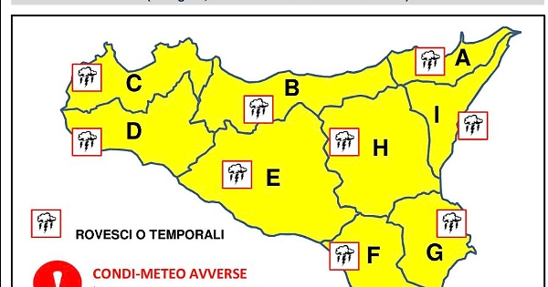 La Protezione civile ha diramato l'allerta gialla in Sicilia per temporali che sono previsti in diverse zone della regione. Da domani e per le prossime 36 ore sono previsti precipitazioni sparse e diffuse. I rovesci saranno di forte intensità e sono previste locali grandinate con forti raffiche di vento.