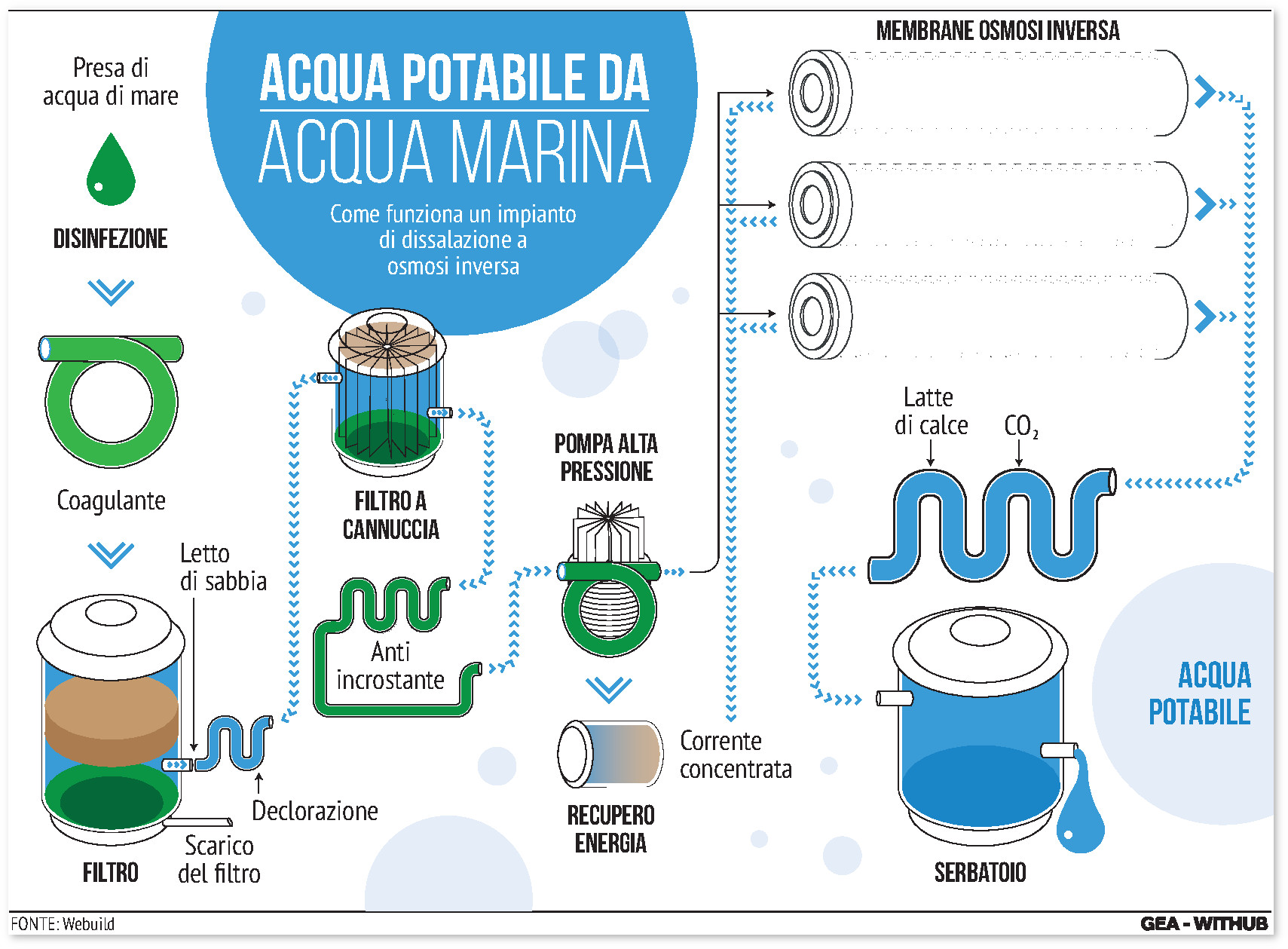 Ma il vero punto è: la messa in funzione dei dissalatori risolverà l’emergenza idrica in Sicilia? La risposta è “ni”, perché l’acqua dissalata può essere solo un supporto e una integrazione rispetto a quella fornita dai pozzi e dagli invasi tenuto conto che il fabbisogno giornaliero di una provincia come ad esempio quella di Agrigento è di almeno 1.200 litri al secondo (bene o male identico consumo è quello delle province di Trapani e Caltanissetta). Per avere un altro punto di riferimento basti segnalare che i pozzi gestiti da Siciliacque nell’area centromeridionale della Sicilia possono produrre oltre 1.400 litri al secondo.