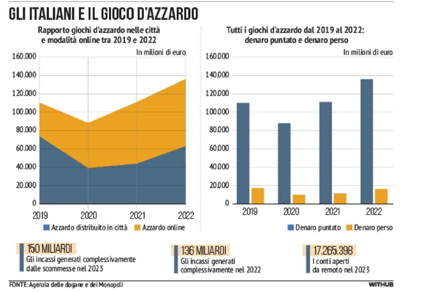 Il costo è elevato per le casse dello Stato dove si garantisce un servizio sanitario a misura di patologia. E se ben contiamo sulla somma di 136 miliardi di euro all’anno solo 10 miliardi finiscono nelle casse del Governo. E “cancellato” il decreto Dignità dell’ex premier Conti, con il quale si impediva la pubblicità dei centri scommesse, ecco riapparire in tv gli spot. Quasi a trovare nuove prede, nuove vittime da far entrare nel vortice del gioco da cui uscirne è difficile. E così c’è chi ci sguazza incamerando miliardi sulle pelle di chi, per noia o solitudine, riesce a trascorrere intere giornate a puntare il proprio denaro per poi finire sul lastrico.