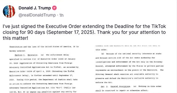 «Ho appena firmato l'ordine esecutivo che proroga la scadenza di TikTok di 90 giorni. Grazie per l'attenzione», ha scritto Trump sul suo social Truth. Nelle scorse ore Trump aveva dichiarato di credere che il presidente cinese Xi Jinping sarebbe favorevole ad un accordo in merito alla vendita dell'app nel caso in cui dovesse presentarsi un acquirente. In una nota la portavoce della Casa Bianca Karoline Leavitt ha sottolineato che l'amministrazione repubblicana desidera garantire che gli americani possano continuare ad accedere a TikTok: «Come ha affermato più volte, il presidente non vuole che TikTok venga oscurato - ha affermato Leavitt -. Questa estensione durerà 90 giorni, durante i quali l'amministrazione si impegnerà a garantire la chiusura dell'accordo, in modo che il popolo americano possa continuare ad utilizzare TikTok con la certezza che i propri dati siano al sicuro".