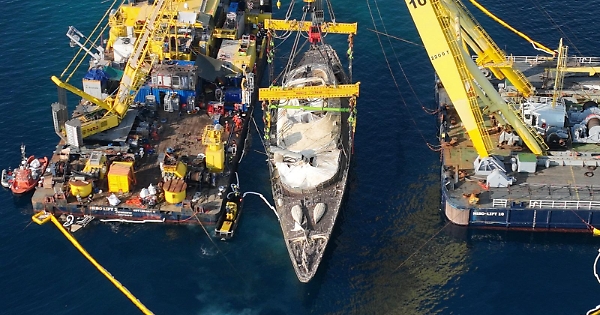 Il veliero del magnate inglese Myke Lynch colato a picco durante una tempesta 10 mesi fa, sarà trasportato oggi via da Porticello, luogo del disastro