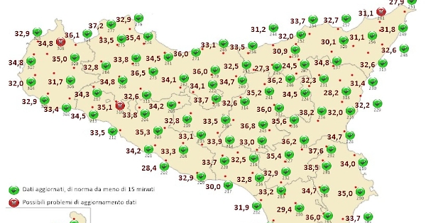 Temperature sopra i 30 gradi in tutte le province siciliane col termometro sopra i 35 gradi soprattutto nella parte Sud orientale. Il servizio informativo agrometeorologico siciliano, alle 9.26, registra una temperatura di 38,5 gradi a Francofonte nel Siracusano, 38,2 a Paternò (Catania), 38 gradi a Motta Sant'Anastasia (Catania). A Catania la temperatura è di circa 33 gradi mentre vicino alla base aerea di Sigonella sulla Sp 104 vengono registrati 38.9 gradi. A Palermo ci sono 32 gradi ma l'umidità fa percepire una temperatura più alta; a Partinico (Palermo) vengono registrati 37,2 gradi. Le temperature sono in aumento.
